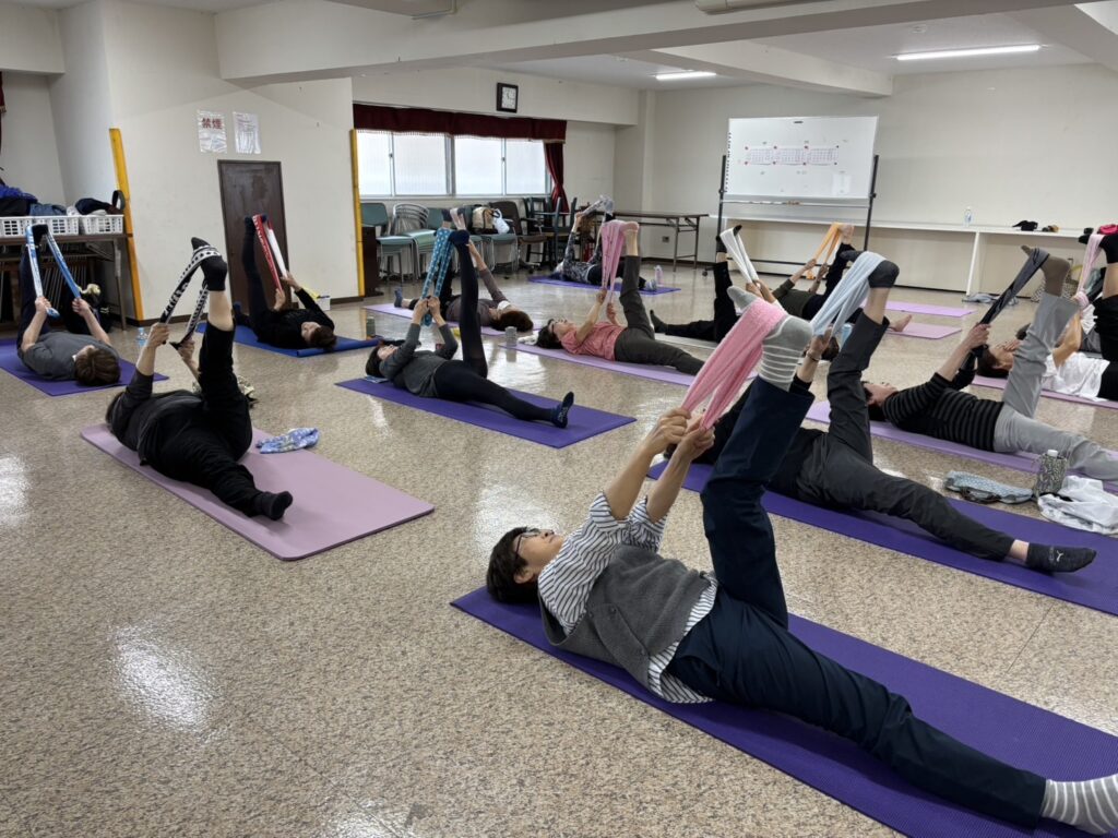 複数人でレッスンを受ける体操教室。みんなで楽しく実践しながら背骨を整えます。